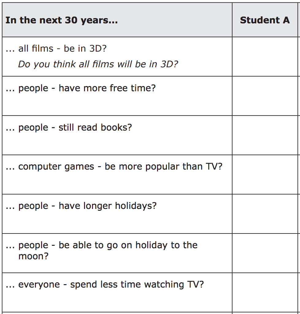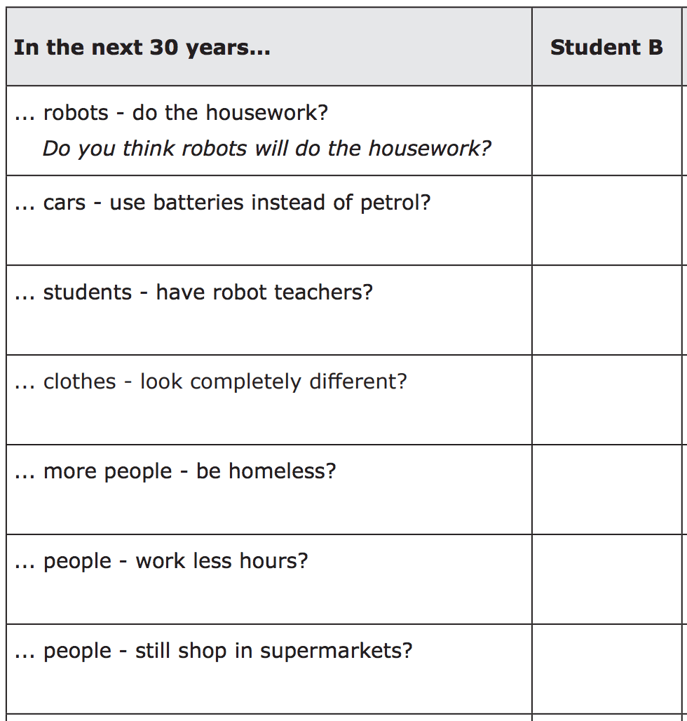 In class two we will learn how to talk about future possibilities using may/will/won’t. Students will work together to talk about what the world will be like in the year 3000.