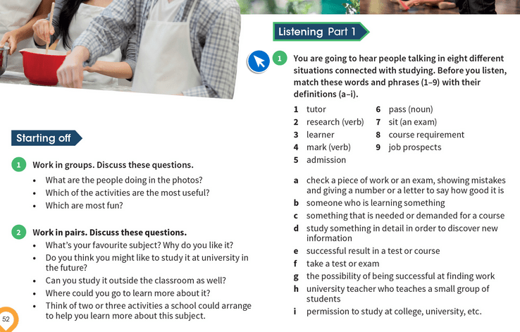 Class 1: we will check the homework then we will continue with the speaking exercise from page 52: Starting off and listening part 1.