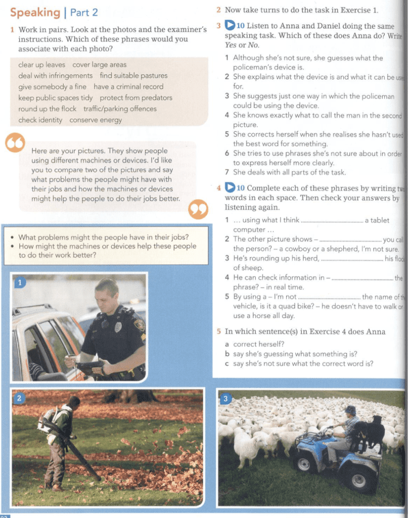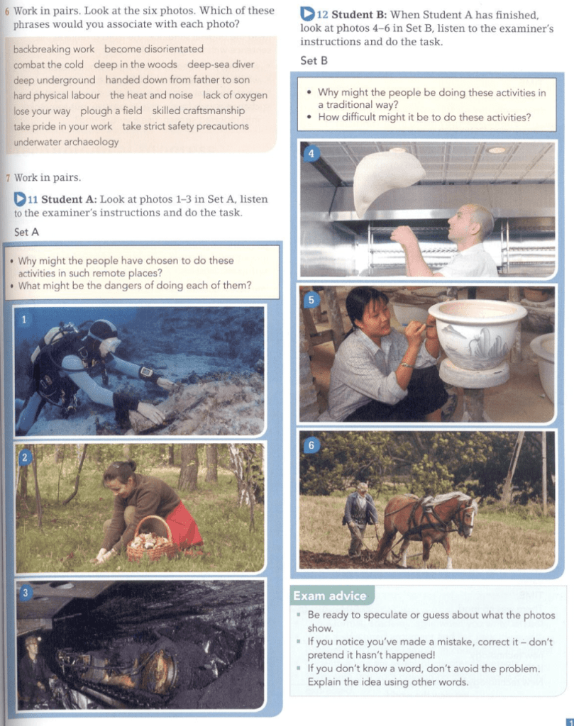 Today we will start off the class with exam practice relating to part 2 of the speaking test (page 102-103. We will look at the photos on page 102 and connect the vocabulary in exercises one to each photo. Then we will complete exercises 3 and 4, which focus on technique and phrases we can include when we speak.