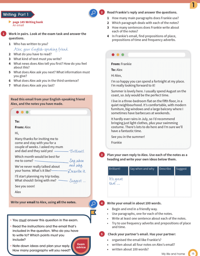 We will finish the class on page 15 by looking at the homework. Students must write a response to the email from Alex. In class we will plan it and brainstorm useful vocabulary and expressions.