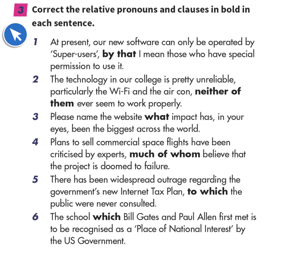 Today we will learn about advanced relative clauses. We will start off with a revision of the basics of defining and non-defining relative clauses with the following Prezi presentation and the correction exercise: