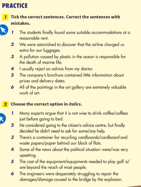 Grammar homework: Complete practice tasks 1 and 2 on page 212.