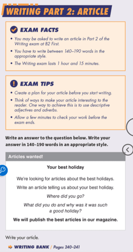 Writing homework: Write an article using the exam focus writing task on page 65.