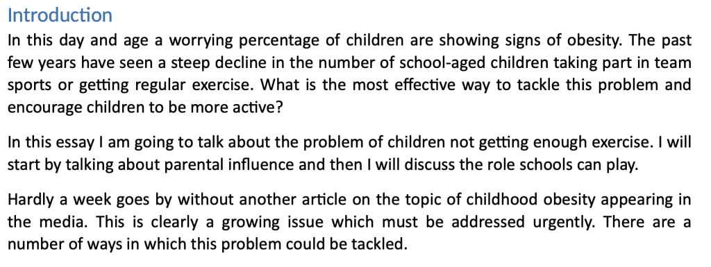 It goes without saying that schools play a vital role in motivating children to exercise regularly since young people spend a huge amount of time there. An obvious example of this is the vast number of sports and exercise clubs that are offered such as football, swimming or even dance classes. Nevertheless, some people argue that sport in school can be too competitive and this may deter children from wanting to exercise. Therefore, there must be a balance between competition and having fun in order to maintain high levels of motivation.