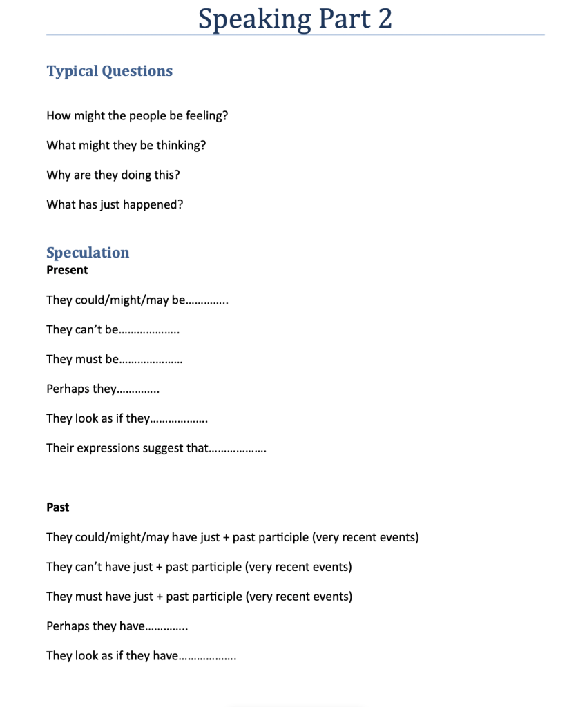 Today we will begin with speaking part 2 exam practice using the photo sets and speculative language (below).