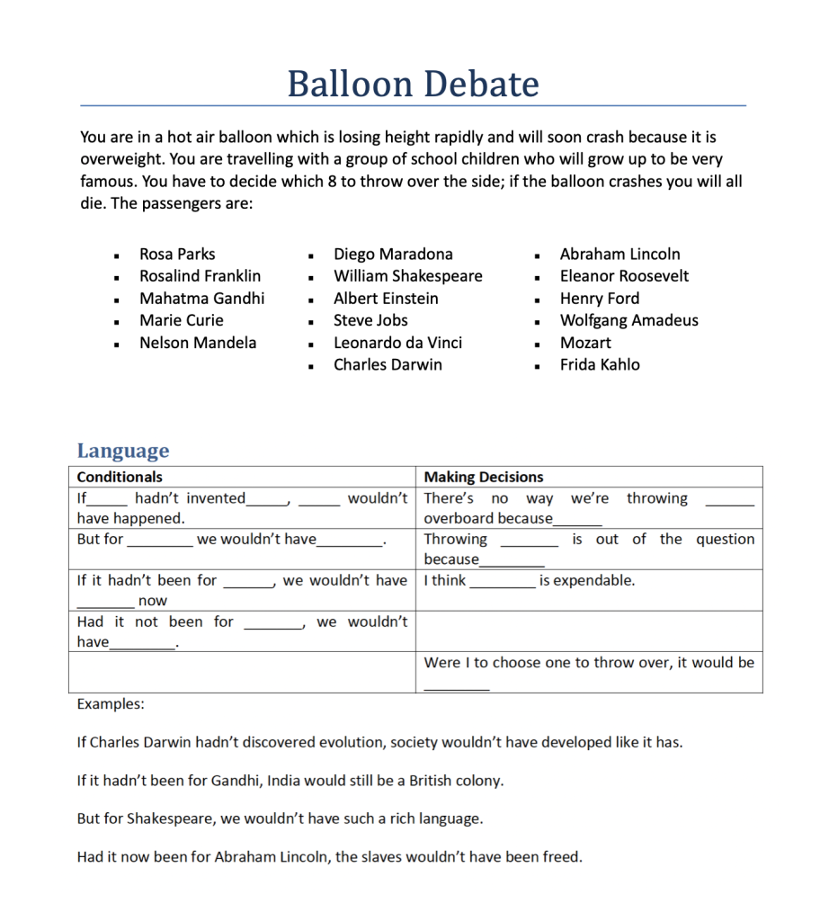 Today we will review conditionals and learn how to invert them. We will start with some group discussion and then complete a controlled speaking task in small groups.
